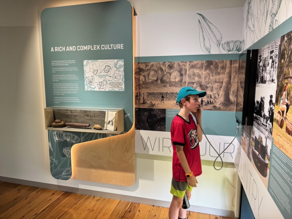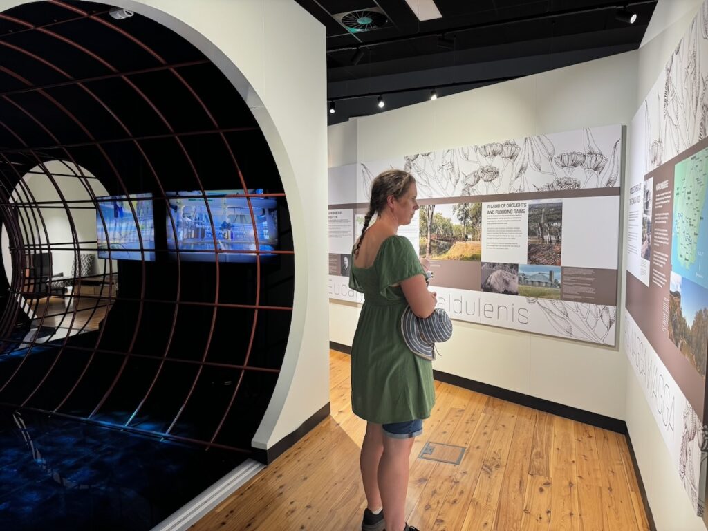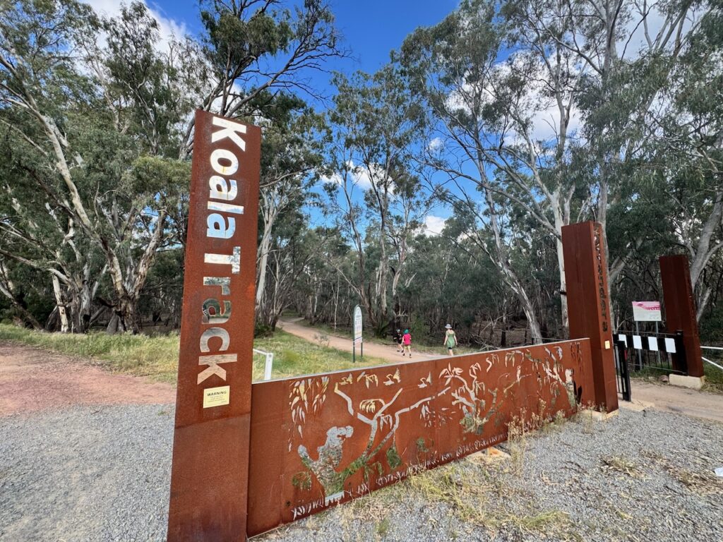 We headed back into town and pulled into the big park that sits right beside the information centre for lunch. After a few different sandwiches and other leftovers that we had with us, we headed into the info centre for a quick look around. We asked the lady what else we should see while we were here – her answer was the water tower art (done), the Lake Talbot Skywalk (we were about to go and do that), and koalas – which surprised us! Turns out Narrandera is very proud of how they’ve rehabilitated the koala population in the surrounding area. They have a huge gum tree forrest on the south side of town which has a large population of koalas that has developed from one male and three females that were brought back into the area in the 70s. While we were in the visitors centre, we had a look through their Discovery Centre, which had a great amount of information and history on Narrandera and its surrounding districts, and also a great acknowledgement of the Wiradjuri peoples – including some of the killings and massacres of Wiradjuri people during the late 1800s.