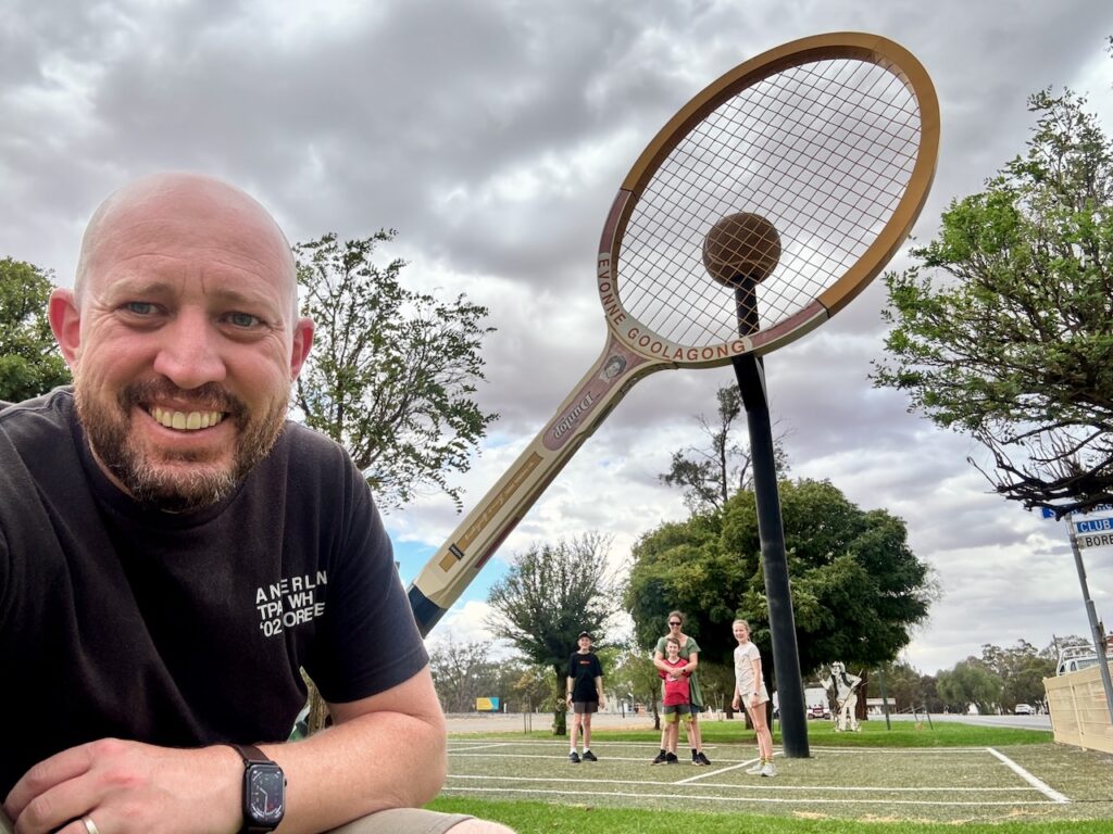 Our plan from there had been to just head the one hour further into the Riverina region to Griffith – but at the info centre in Narrandera, we’d learnt about the little town of Barellan, only 40 mins or so north. It was where Evonne Goolagong had grown up and developed her tennis skills – and there was a tennis racquet sculpture there in her honour! It only added about 30 mins extra to head via Barellan rather than straight to Griffith, so we decided to do just that. It was not only another Big Thing to add to our list, but it was great to read about (and for the kids to learn a bit about) Evonne Goolagong’s early life there in Barellan. The tennis racquet was a big replica of one of her original Dunlop racquets. Just as we were taking some photos and the kids were playing handball on the mini tennis court there, we realised what the orange glow on the horizon was that we’d seen for the past 30 minutes or so – it was a pretty decent dust storm that enveloped the town! We quickly rushed back to the car trying to avoid getting dust in our eyes and through the car, and headed off toward Griffith.