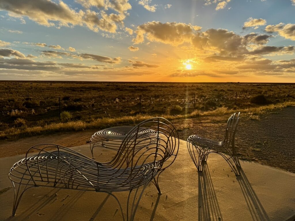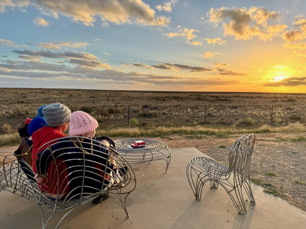 Once we made it across the very beautiful and very flat Hay Plains, we headed straight to the north side of town where a sunset viewing area has been set up on the side of the Cobb Hwy. It’s an area far enough out of town that there is pretty much nothing in any direction – except the flat and open plains. It was the perfect spot to sit and watch the sunset together! We’d picked up some biscuits and dip just outside of Griffith on our way out, and so we sat and snacked on those (and rugged up a bit) for about half an hour. There were a few clouds around, so it wasn’t the picture-perfect drop below the horizon – but it was still spectacular.
