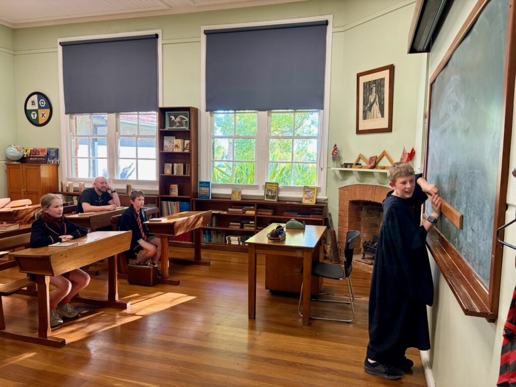 We finished up at the zoo by about 3pm or so with some ice creams. And although we were feeling a bit tired, we decided to try again with the Western Plains Cultural Centre. This time it was definitely open and we could explore a bit more! There was a few great exhibits on. The first was a short exhibit about the history of the main radio station in Dubbo – 2DU. Then into the main room their museum was a huge amount of different items from the history of Dubbo, including a great series of photos of different main streets in Dubbo and a list of what shops has been in them each decade! The kids were taken by the room that was set up like a Dubbo High School room from the 1950s.
